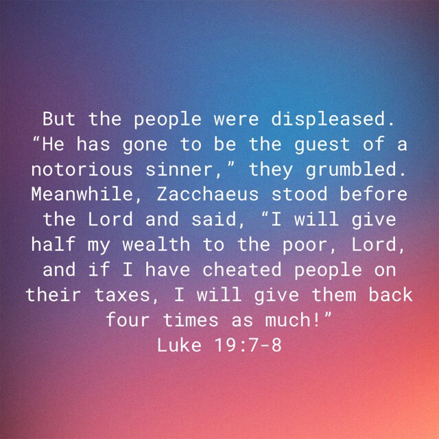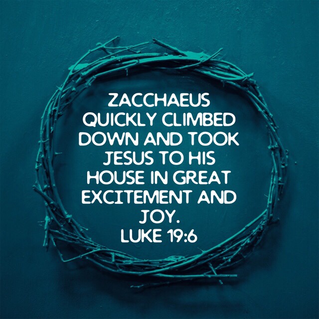 But here is the kicker. Zacchaeus just wanted to SEE Jesus. He had no expectation of bringing him to his home. Yet when Jesus told him to come down and he would dine at his home, Zacchaeus felt JOY and EXCITEMENT! Do you know what I think I would have felt in that moment. Oh man I gotta go clean up my house right now!! I’ve got to get anything sinful out of it and make it spotless, and then I’ll allow Jesus to enter. But that’s not what Zacchaeus did. He took him right to his home with joy and excitement.